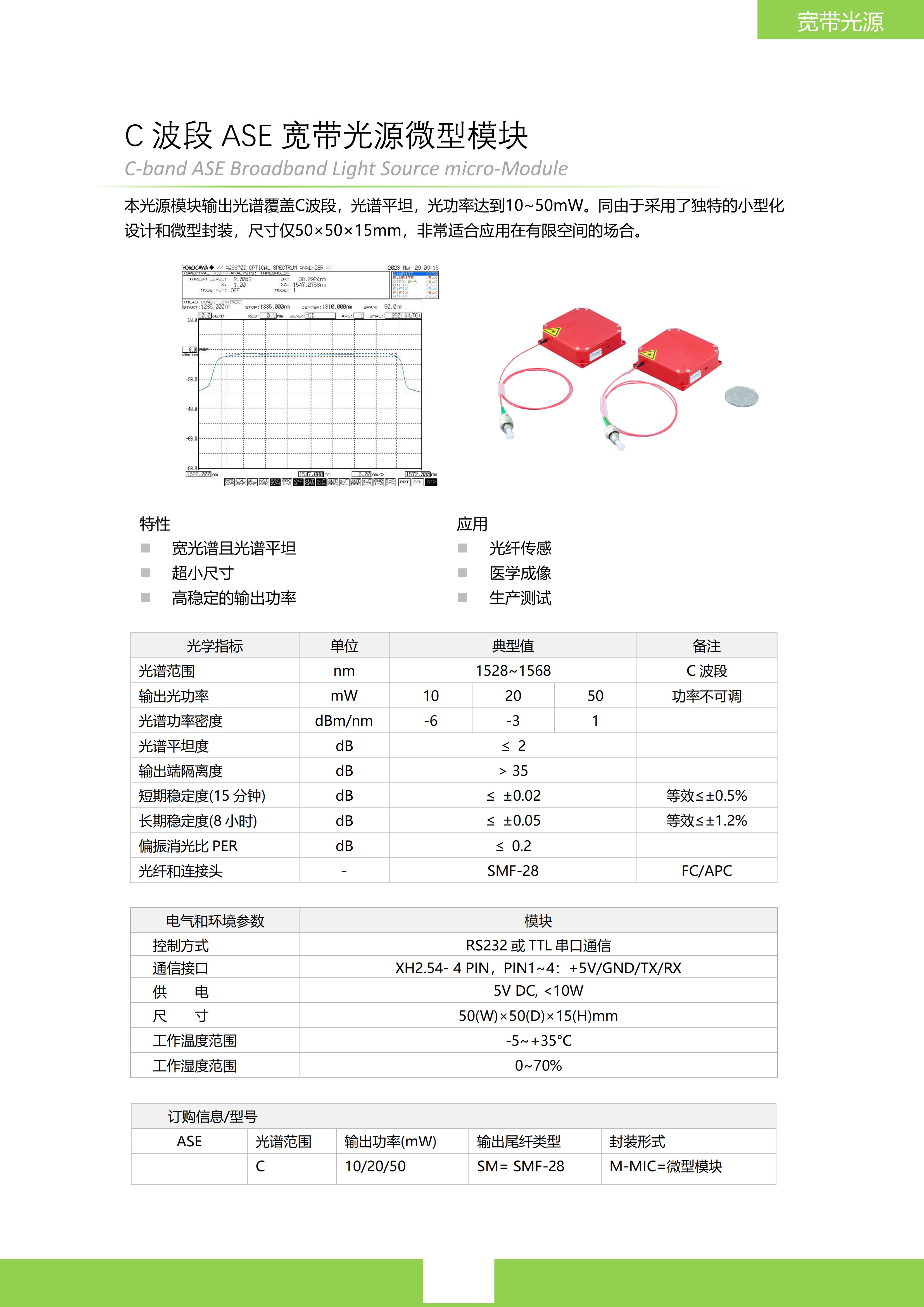 C波段ASE宽带光源微型模块输出光谱覆盖C波段,光谱平坦,光功率达到10~50mW。同由于采用了较好的小型化设计和微型封装,尺寸仅50×50×15mm,非常适合应用在有限空间的场合。